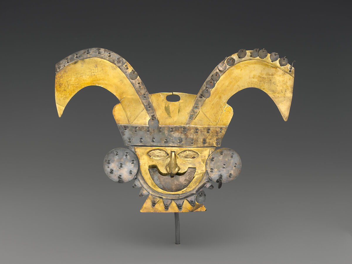 This resplendent nose ornament depicts an individual wearing a crescent-shaped nose ornament, large earspools, and a turbaned headdress with projecting plumes, fastened under the chin with a patterned textile band. The object was cut from a piece of gold sheet and the design was worked from both sides. The chinstrap, ear and nose ornaments, headband and upper region of each plume were subsequently silvered. The nose, rendered in high relief, was produced from a separate sheet of gold and was attached to the face by tabs. In addition, dangles were originally affixed throughout the silvered regions, although now only a few survive—on the headdress and ear spools. The eyes were probably once inlaid with white shell; turquoise or a dark stone likely would have been added to represent the pupils. In its original state, the contrast between the gold and the silver—including the shimmering dangles—and the bright eyes must have created a striking display of beauty and power.
