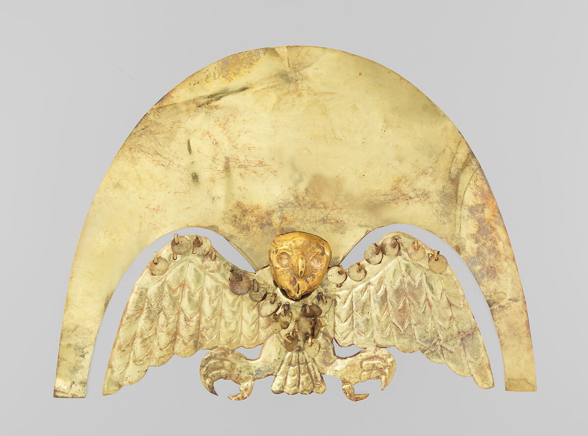 This tiny but impressive headdress is a scaled-down version of a type of ornament worn by high-ranking individuals in Moche society on Peru’s North Coast in the first millennium of the Common Era. The headdress was created from two pieces of hammered gold sheet cut into the shape of an owl with outstretched wings surmounted by a large crescent. Details such as the wings’ feathers were added in repoussé, a technique where the metal sheet is worked from behind. The owl’s head—not original to this object—was created separately and attached by a long pin inserted into a hole in the body of the figure, as seen on related ornaments (see MMA 1987.394.56). A row of circular dangles was attached to the top of the wings with thin gold wires; additional dangles were added to the bird’s torso.