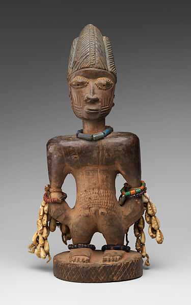 Yoruba peoples have one of the highest incidents of twin births in the world. As a result, twins are regarded as extraordinary beings protected by Sango, the deity of thunder. They are believed to be capable of bestowing immense wealth upon their families or misfortune to those who do not honor them. Powerful spirits in life, twins are honored with carved memorial figures when they die. These figures, known as ere ibeji (literally meaning ere: sacred image; ibi: born; eji: two), remain a point of access to the spirit of the departed individual. The mother provides ritual care to the figures, bathing, dressing, adorning, and feeding them. Such daily handling is responsible for giving their surface its distinctive patina. Ere ibeji invariably represent their subjects with mature adult physiognomies, and are often crowned with elaborate hairdos.