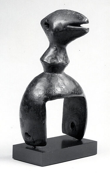 Baule peoples and their neighbors to the West, the Guro, are famous as weavers, and are known for their fine indigo-and-white cotton fabrics. Used on the traditional narrow-band loom, heddle pulleys are functional objects used to ease the movements of the heddles while separating the warp threads and allowing the shuttle to seamlessly pass through the layers of thread. Like many other carved objects used in everyday activities among the Baule, these pulleys were often embellished for the weaver’s delight. Scholars have suggested that the prominent display of pulleys, hanging over the weaver’s loom in the public place, afforded artists their best opportunity to showcase their carving skills, in the hope to attract commissions for figures and masks. This figurative pulley with stylized bird head and bi-conical neck demonstrates the efforts put by Baule and Guro artists into beautifying the simplest functional object.