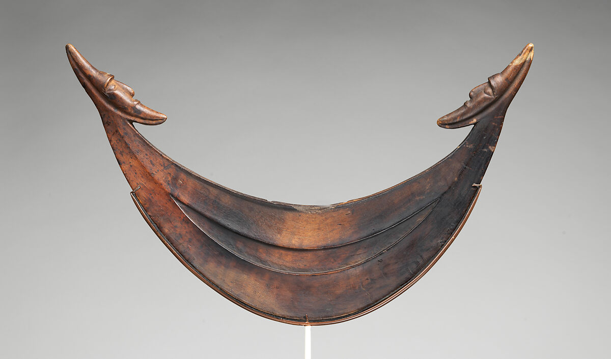 Rei miro typically consist, as in this example, of a flat wooden crescent adorned at each end by an anthropomorphic head depicted in profile. The central portion is decorated with a shallow intaglio crescent, whose form echoes the curve of the ornament. Rapa Nui artists also created a number of variants on the rei miro image, in which other forms, such as the tails of whales, are substituted for the human heads.