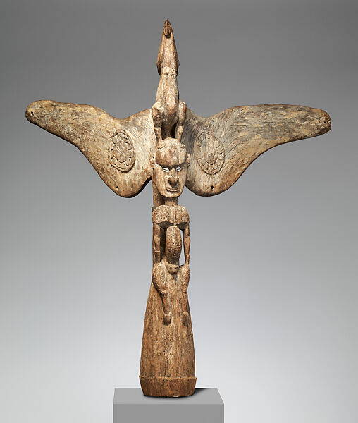 The art of the Sawos, Iatmul, and neighboring peoples in the Middle Sepik region of northeastern New Guinea is primarily associated with their impressive men’s ceremonial houses, which are seen as the embodiments of primordial female ancestors. The triangular gables at either end of Sawos and Iatmul men’s houses rise into steep peaks crowned by separately carved wood finials that depict human figures with birds, usually eagles, perched above them. Local interpretations of this imagery vary. In some instances, the human images are said to represent enemies