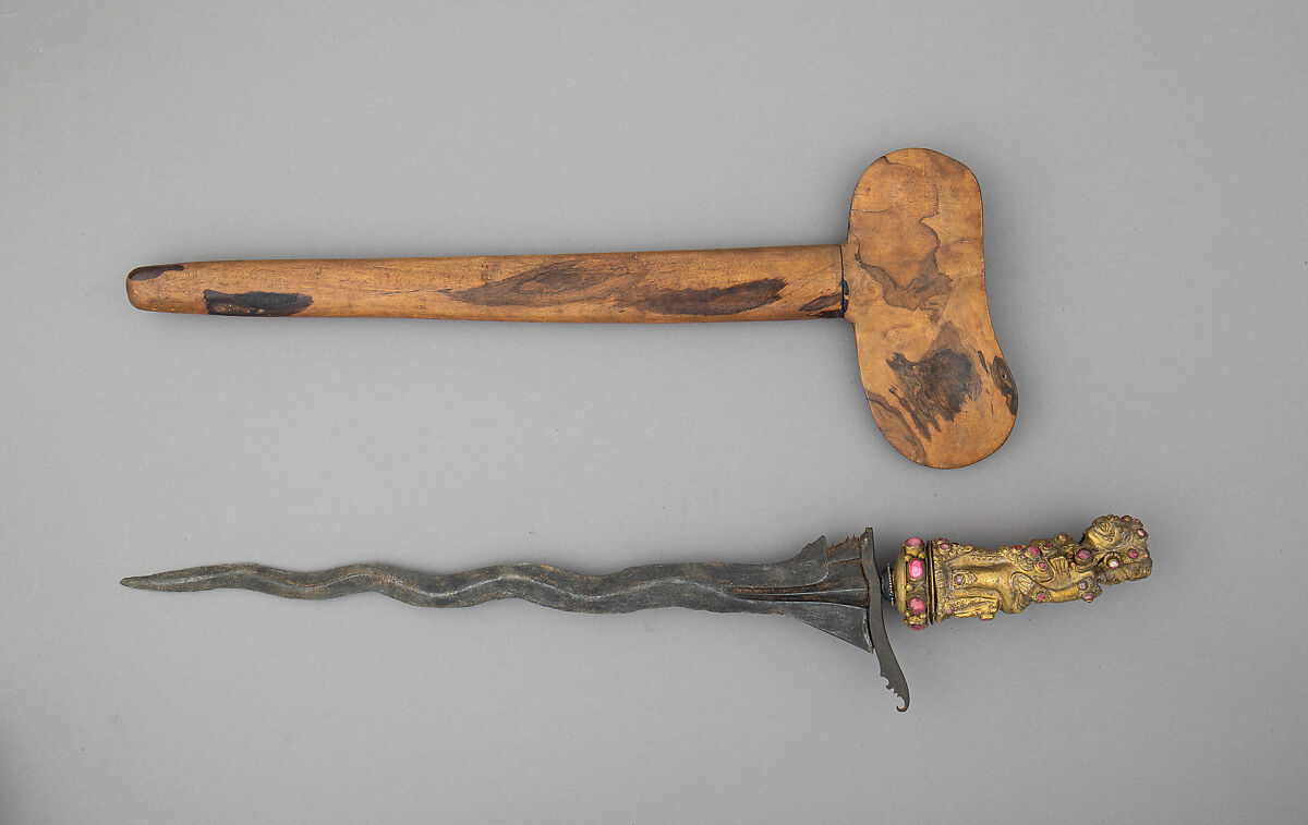 - Medium: Steel, pelet wood (possibly kajoe), gold, semiprecious stones, copper alloy