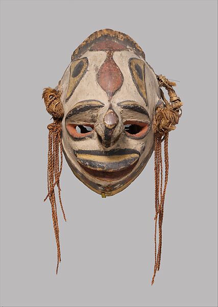 The masks of the Biwat people of the Yuat River, a tributary of the Lower Sepik River, appear to have portrayed two major types of supernatural beings: forest spirits, who lived in the woods surrounding the village, and water spirits, who inhabited rivers and other bodies of water. This mask likely represents a water spirit. In one Biwat village, similar masks formed the heads of human-like figures erected on the backs of gigantic reptilian effigies representing the Crocodile Mother, who symbolically swallowed and later disgorged young novices during initiation rites. The masks also were probably worn on the head during other ceremonies. The cane armature on the back of this example likely served to hold it in place.
