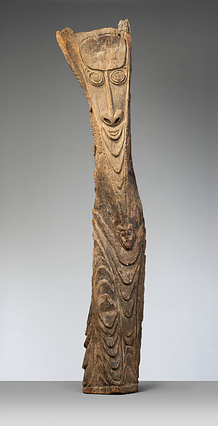 The imposing men’s ceremonial houses of the Iatmul people of the Middle Sepik River region in northeast New Guinea are supported by large wood posts. These house posts portray a variety of animals, human-like images, and geometric motifs, which represent primordial beings and phenomena drawn from the oral traditions of the clans associated with the house. This work is the upper portion of an Iatmul house post, probably one of a row of several similar posts originally positioned along the long axis of the ceremonial house to support the main roof beam. The face on the top likely represents a windjembu, a type of tree spirit that communicates with the human world by speaking through the mouth of a religious specialist, when he is in a deep trance. The face is flanked by remnants of crocodile images. The wave-like patterns below, which also likely covered the missing lower portion of the post, represent the primordial waters of the early creation period.