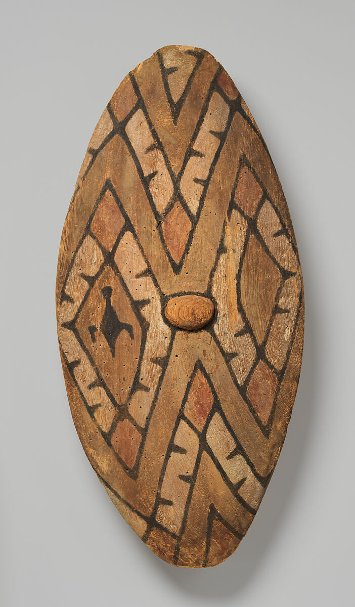 Vibrantly patterned rainforest shields were made by the Yidinj people and neighboring clans from the region around Cairns in northeast Queensland. The shields were used in both combat and ceremony and were only carried by men, who would receive a shield following the completion of their initiation rites that marked the transition into adulthood.Rainforest shields often exhibit a distinctive kidney shape, a result of the curved structures of the native fig tree buttress roots from which they are carved. However, the current example is largely symmetrical. It features a central boss on the front of the shield that was designed to increase the strength of the piece. This shield also features a painted birdlike figure to the right of the central boss. Figurative designs are uncommon in Rainforest shields and the meaning of this motif is unknown. A handle on the bark of the work has been created by carving out the negative space underneath it. The shields were typically painted by two initiated men who worked simultaneously on the design, one starting at each end. While the designs appear abstract, they are based on hereditary knowledge of clan designs that refer to people, animals and Country. Thus, despite the hands of two artists being present on a single shield, there is a strong visual cohesion across the work.Today rainforest shields and their designs are a source of inspiration for several contemporary Aboriginal artists from the rainforest region including Michael Anning and Paul Bong.