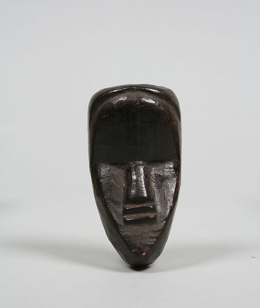 Most Dan face masks genre, and those of the culturally related groups of Côte d’Ivoire and Liberia, are commonly executed in a miniature form, ranging in height between 6 and 20 centimeters. Even the largest miniatures are too small to be worn in front of the face, and they rarely exhibit any means by which they may be attached to anything. The most common mask type represented in such diminutive form is deangle (attractive mask with slit eyes, performs a feminine behavior) while the least common miniature forms are masks with tubular eyes and animal mouths.