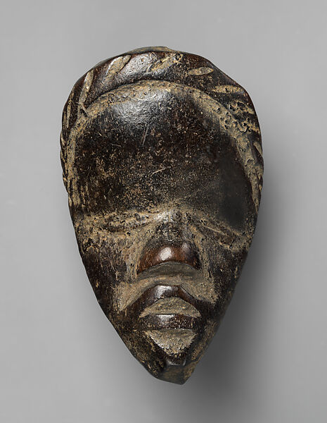 Miniature masks bear many names: the most common is ma go (small head), but depending on scholarship it has also be named yi luo po (thing which water is poured over), gba po (thing which is fed), or nyonkula (substitute for the ancestors). Echoing the variety of names, they fulfill a variety of functions. Anyone who has a spiritual connection with a mask, or whose family owns an important mask, is entitled to commission a miniature. Rubbed with oil and food, they are wrapped up and kept on the owner’s body or among his possessions and function as portable and personal forms that share the power and protective force of the full-sized mask. Miniature masks are carved to embody tutelary spirits and serve as testimony to the presence of the spirit associated with a large masquerade. When a mask-owner is travelling, the miniature mask serves as an important means of identification outside his immediate community. This role that may have given it the commonly applied name of "passport mask."