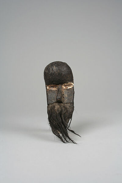 Miniature masks bear many names: the most common is ma go (small head), but depending on scholarship it has also be named yi luo po (thing which water is poured over), gba po (thing which is fed), or nyonkula (substitute for the ancestors). Echoing the variety of names, they fulfill a variety of functions. Anyone who has a spiritual connection with a mask, or whose family owns an important mask, is entitled to commission a miniature. Rubbed with oil and food, they are wrapped up and kept on the owner’s body or among his possessions and function as portable and personal forms that share the power and protective force of the full-sized mask. Miniature masks are carved to embody tutelary spirits and serve as testimony to the presence of the spirit associated with a large masquerade. When a mask-owner is travelling, the miniature mask serves as an important means of identification outside his immediate community. This role that may have given it the commonly applied name of "passport mask."