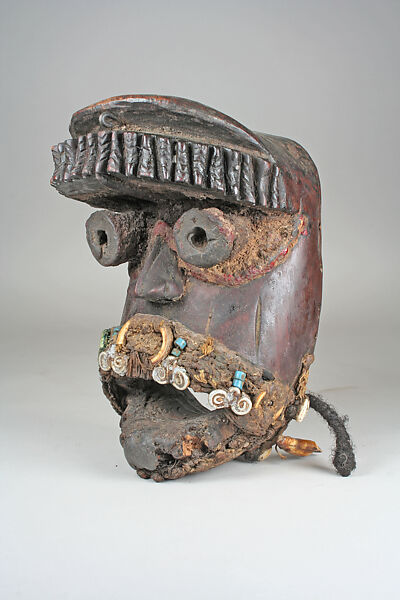 Dan masks have been documented as the embodiment of at least a dozen artistic personalities. Among these are Deangle, who ventures into the village from the initiation camps to ask women for food; Tankagle and Bagle, who entertain through a range of aesthetically pleasing dances, skits, and mimes; Gunyege, whose mask is worn by a community's champion foot racers in competitions; and Bugle, who historically leads men into battle. This example's protruding eyes and row of carved horns on the forehead indicate that this is probably a kagle mask. Kagle masks are "troublemakers", meant to disturb village festivities with their erratic movements and agressive behavior. Intended to symbolize the brutal force of the bush and of savage, nonhuman creatures, the "troublemaker" is in fact a test of the solidity of social institutions. Its disruptive performance serves a social function by teaching the value of order and discipline through its negative example.