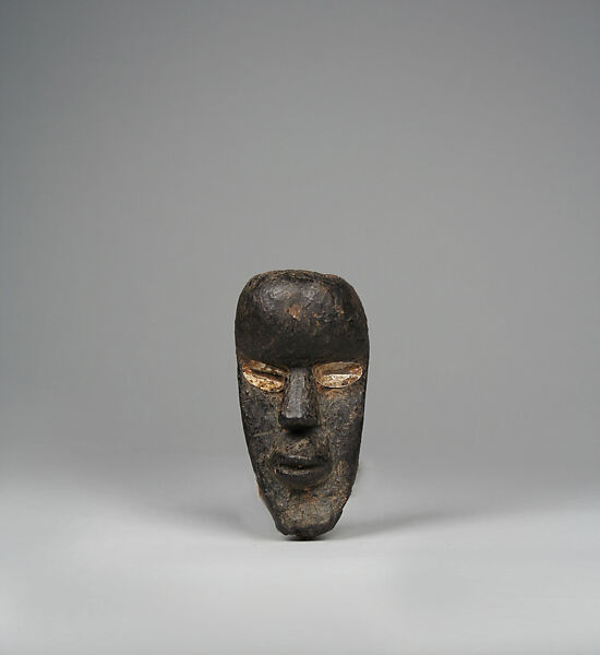 Most Dan face masks genre, and those of the culturally related groups of Côte d’Ivoire and Liberia, are commonly executed in a miniature form, ranging in height between 6 and 20 centimeters. Even the largest miniatures are too small to be worn in front of the face, and they rarely exhibit any means by which they may be attached to anything. The most common mask type represented in such diminutive form is deangle (attractive mask with slit eyes, performs a feminine behavior) while the least common miniature forms are masks with tubular eyes and animal mouths.