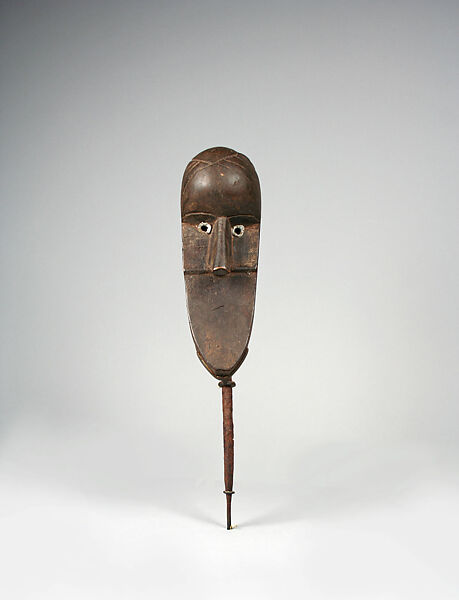 Most Dan face masks genre, and those of the culturally related groups of Côte d’Ivoire and Liberia, are commonly executed in a miniature form, ranging in height between 6 and 20 centimeters. Even the largest miniatures are too small to be worn in front of the face, and they rarely exhibit any means by which they may be attached to anything. The most common mask type represented in such diminutive form is deangle (attractive mask with slit eyes, performs a feminine behavior) while the least common miniature forms are masks with tubular eyes and animal mouths.