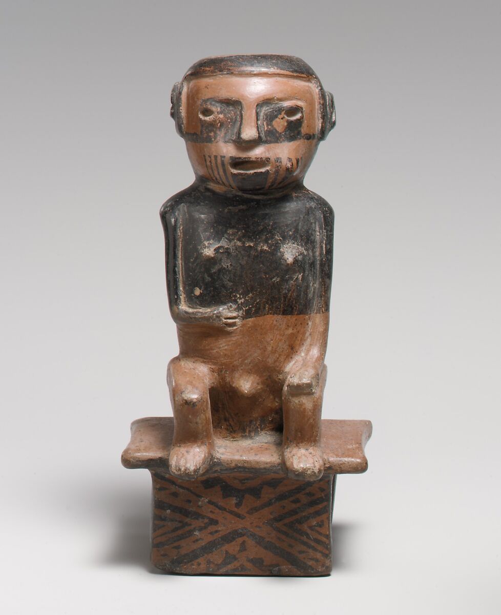 Hand modeled and hollow, Capulí style figures are found on both sides of the Colombia/Ecuador border. A common depiction is a male seated on a bench. A wad of coca leaves makes a conspicuous budge in his cheek. The figure's upper torso and hair are resist decorated in black on light brown, and black designs embellish the face and bench. The surface is well polished.