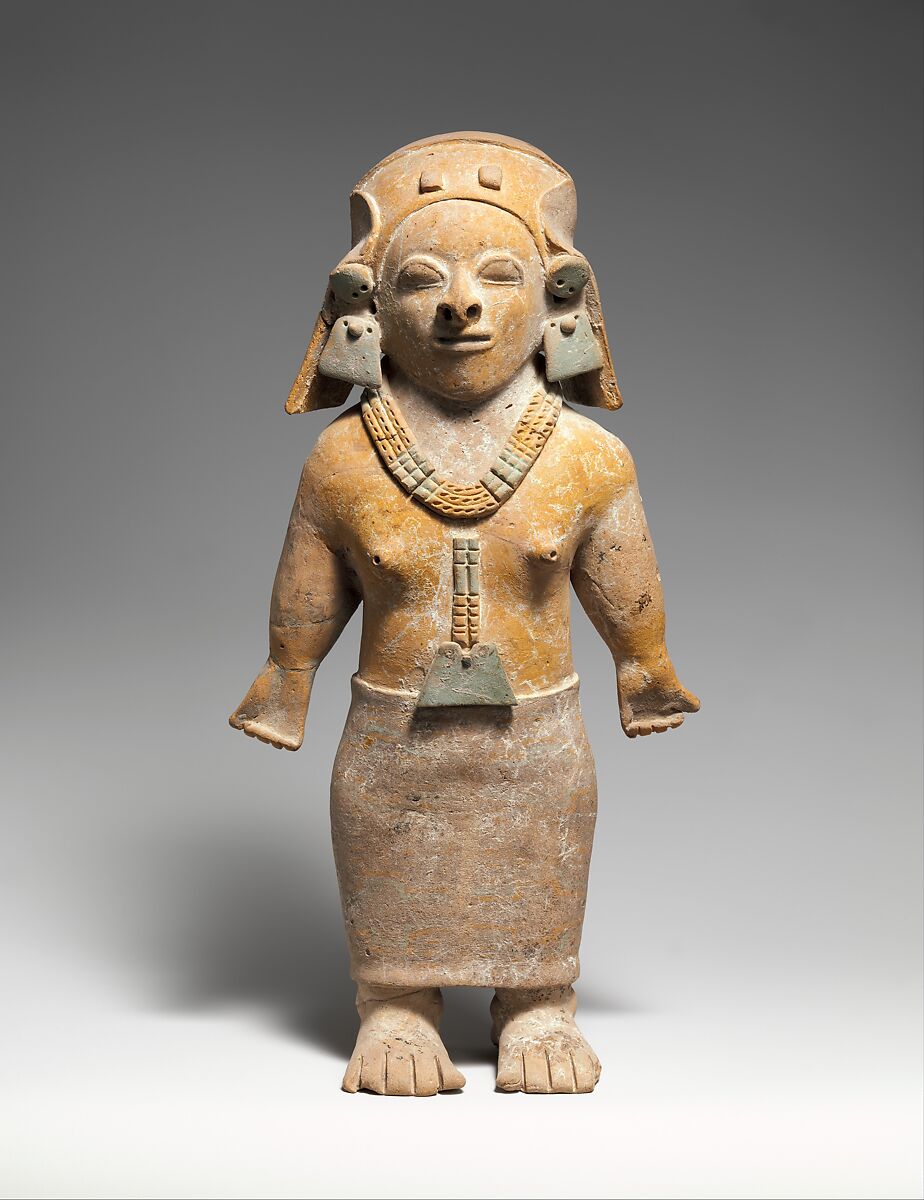 This bare-chested female figure wears a long skirt, a multistrand necklace with a sizable pendant, and a decorated head cover. The hole in the nasal septum once held an ornament likely of gold. The pale green pigment of the ornaments applied after firing, perhaps representing greenstone such as jade, turquoise, or even emerald, contrasts with the light brown of her torso and the darker brown of her skirt.