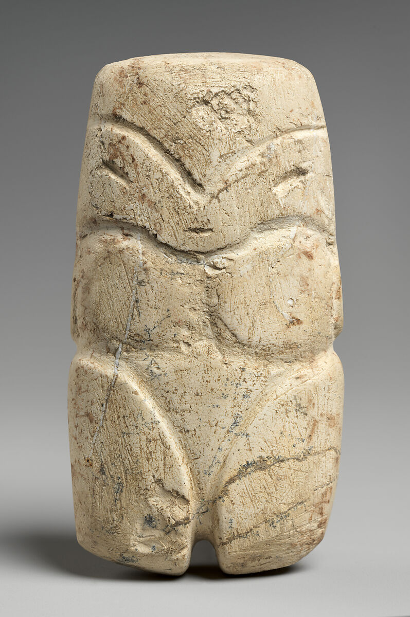 As one of the first civilizations in the Americas to produce figural representations around 3000 BCE, early figures like this were created from a variety of calcium carbonate stones. Later works, like MMA 1988.117.1 and 1988.117.2, would be formed from clay and pigmented. While the exact function of these figurines remains unknown, archaeologists have found these figures in both domestic and funerary settings. Perhaps relating to the ideas of production, progeny, and protection, they would have played a part in every phase of Valdivian life.