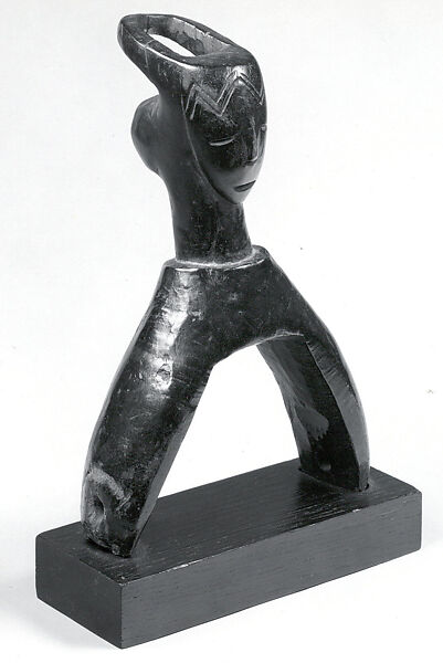 Baule peoples and their neighbors to the West, the Guro, are famous as weavers, and are known for their fine indigo-and-white cotton fabrics. Used on the traditional narrow-band loom, heddle pulleys are functional objects used to ease the movements of the heddles while separating the warp threads and allowing the shuttle to seamlessly pass through the layers of thread. Like many other carved objects used in everyday activities among the Baule, these pulleys were often embellished for the weaver’s delight. Scholars have suggested that the prominent display of pulleys, hanging over the weaver’s loom in the public place, afforded artists their best opportunity to showcase their carving skills, in the hope to attract commissions for figures and masks. This figurative pulley, distinctive for morphing human facial features and animal horns, demonstrates the efforts put by Baule artists into beautifying the simplest functional object.