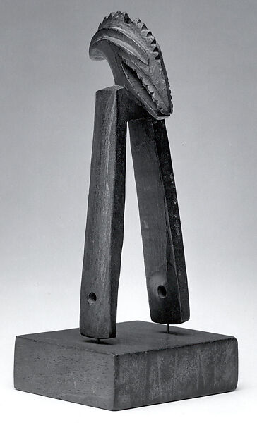 Baule peoples and their neighbors to the West, the Guro, are famous as weavers, and are known for their fine indigo-and-white cotton fabrics. Used on the traditional narrow-band loom, heddle pulleys are functional objects used to ease the movements of the heddles while separating the warp threads and allowing the shuttle to seamlessly pass through the layers of thread. Like many other carved objects used in everyday activities among the Baule, these pulleys were often embellished for the weaver’s delight. Scholars have suggested that the prominent display of pulleys, hanging over the weaver’s loom in the public place, afforded artists their best opportunity to showcase their carving skills, in the hope to attract commissions for figures and masks. In this example, the long body is topped by a stylized head of a bird with open beak and crenelated crest. It demonstrates the efforts put by Baule and Guro artists into beautifying the simplest functional object.