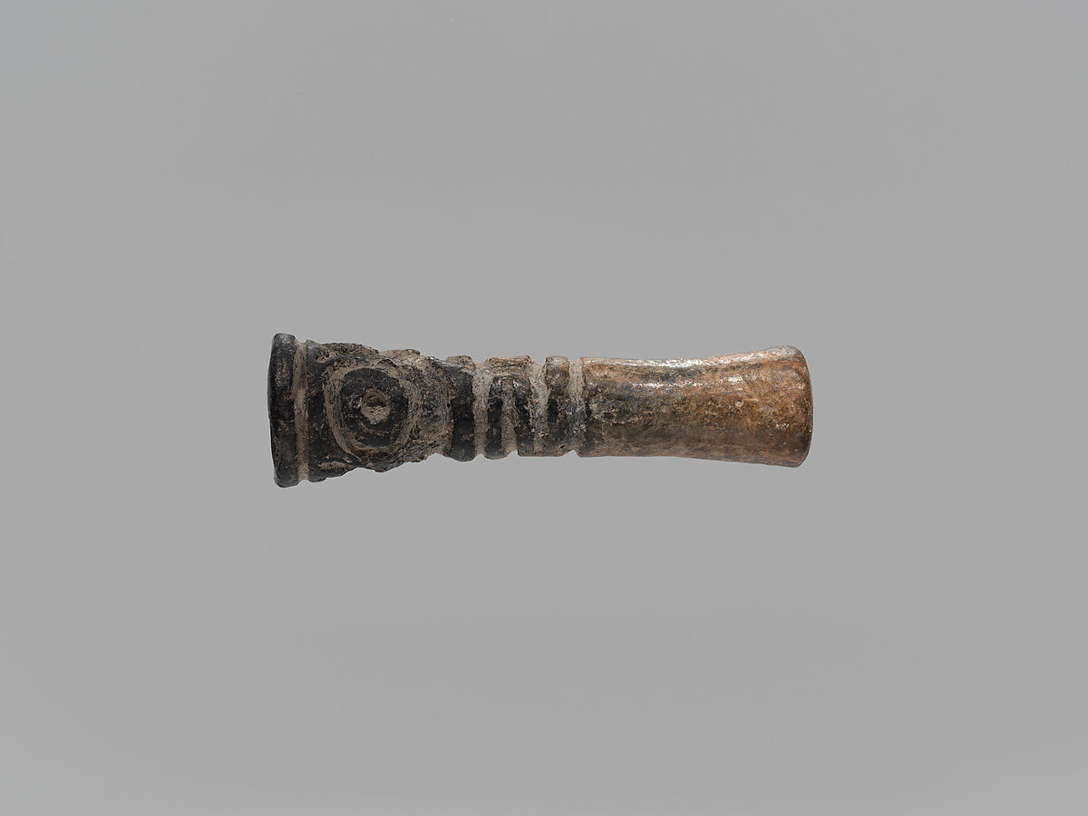 This bone ear ornament contains stylized motifs related to zemí imagery. Zemí (or cemí) is a term used by Taíno peoples, the diverse societies that inhabited the Antilles archipelago before European contact, that linguistically relates to a quality akin to sweetness. Zemí refers not to an object or image but to an immaterial, spiritual, and vital force pertaining to deities and ancestors. There are several known zemí identities recorded by the Spanish, some of which have been linked to archaeological images.