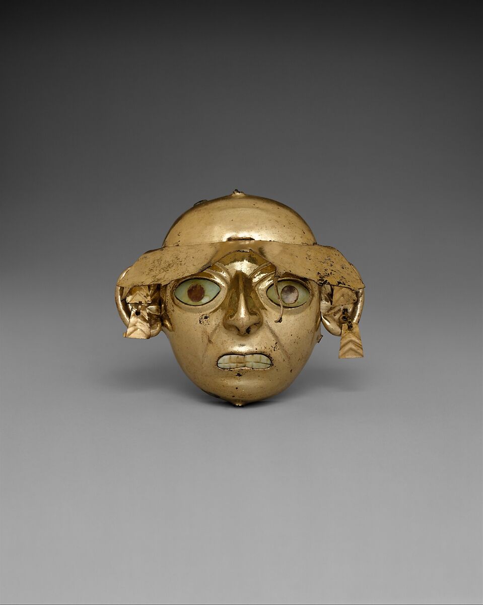 This striking ornament made of gilded copper sheet in the shape of the front of a head has inlaid eyes of green and black stone and teeth made from shell. The ears are attached to the face with small tabs, as is a visor above the eyes. Abrasion on the nasal septum suggests that a miniature nose ring was once present. Trapezoidal ornaments with V-shaped incisions are attached to the ears. Remnants of seven thin wires protrude from the front of the visor. These may have once supported dangles, now lost. Four perforations, one below each ear and one on the top and bottom of the head, suggest that it was originally bound to a backing such as a banner.