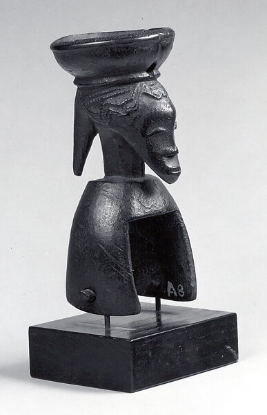 Baule peoples and their neighbors to the West, the Guro, are famous as weavers, and are known for their fine indigo-and-white cotton fabrics. Used on the traditional narrow-band loom, heddle pulleys are functional objects used to ease the movements of the heddles while separating the warp threads and allowing the shuttle to seamlessly pass through the layers of thread. Like many other carved objects used in everyday activities among the Baule, these pulleys were often embellished for the weaver’s delight. Scholars have suggested that the prominent display of pulleys, hanging over the weaver’s loom in the public place, afforded artists their best opportunity to showcase their carving skills, in the hope to attract commissions for figures and masks. This pulley adorned by a stylized head carrying a vessel demonstrates the efforts put by Baule and Guro artists into beautifying the simplest functional object.