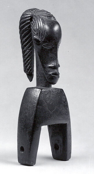 Baule peoples and their neighbors to the West, the Guro, are famous as weavers, and are known for their fine indigo-and-white cotton fabrics. Used on the traditional narrow-band loom, heddle pulleys are functional objects used to ease the movements of the heddles while separating the warp threads and allowing the shuttle to seamlessly pass through the layers of thread. Like many other carved objects used in everyday activities among the Baule, these pulleys were often embellished for the weaver’s delight. Scholars have suggested that the prominent display of pulleys, hanging over the weaver’s loom in the public place, afforded artists their best opportunity to showcase their carving skills, in the hope to attract commissions for figures and masks. This figurative pulley topped by a human head with bulging forehead and long tress demonstrates the efforts put by Baule and Guro artists into beautifying the simplest functional object.