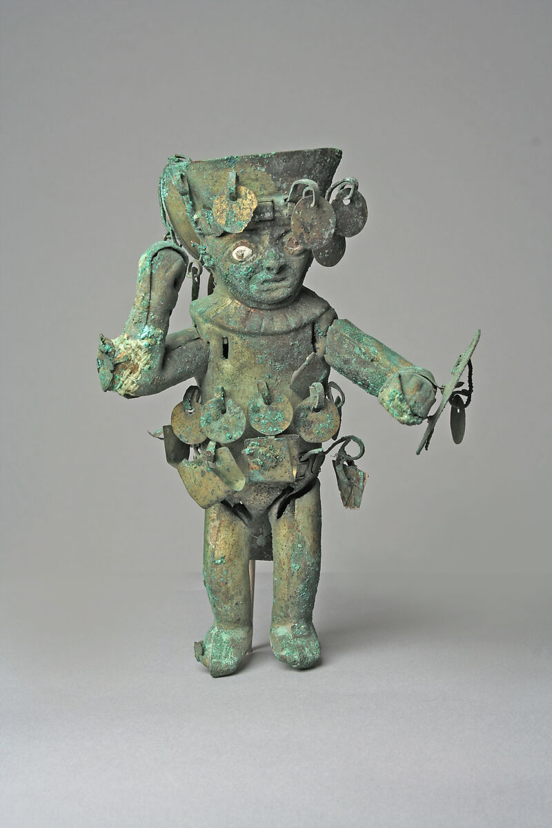 The torso is made up of front and back halves held in place by pressure, whereas each limb was constructed with a single sheet joined to the body by small tabs. The figure’s face was completed with inlaid shell eyes with stone pupils. The figure wears a hat, and a collar is indicated in repoussé. The warrior is shown wearing an animal skin on his back, perhaps that of a feline; its tail was attached separately. Rectangular and circular dangles were attached via wires.