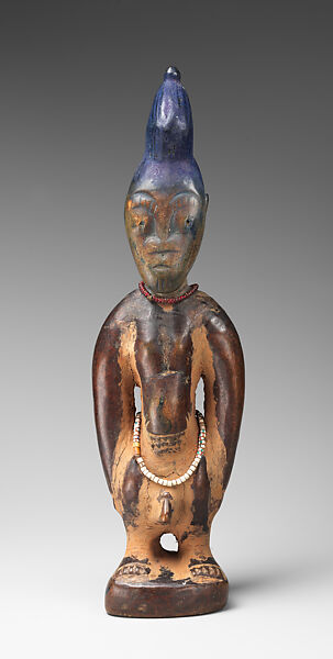 Yoruba peoples have one of the highest incidents of twin births in the world. As a result, twins are regarded as extraordinary beings protected by Sango, the deity of thunder. In the Oyo region, they are believed to be capable of bestowing immense wealth upon their families or misfortune to those who do not honor them. Powerful spirits in life, twins are honored with carved memorial figures when they die. These figures, known as ere ibeji (literally meaning ere: sacred image; ibi: born; eji: two), remain a point of access to the spirit of the departed individual. The mother provides ritual care to the figures, bathing, dressing, adorning, and feeding them. Such daily handling is responsible for giving their surface its distinctive patina. Ere ibeji invariably represent their subjects with mature adult physiognomies, and are often crowned with elaborate hairdos.