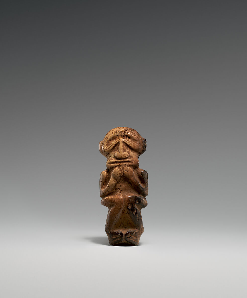 This stone pendant, worn by Taíno leaders and healers, features a crouching anthropomorphic figure known as a zemí. Zemí (or cemí) is a term used by Taíno peoples, the diverse societies that inhabited the Antilles archipelago before European contact, that linguistically relates to a quality akin to sweetness. Zemí refers not to an object or image but to an immaterial, spiritual, and vital force pertaining to deities and ancestors. There are several known zemí identities recorded by the Spanish, some of which have been linked to archaeological images.