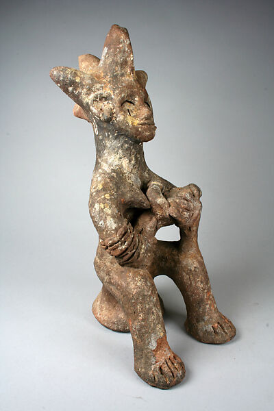 Such figurative terracottas created for shrines may be commissioned directly from a female potter or acquired at market. Known as ntekpe, these "children of the shrine" often take the form of pairs of male and female figures or a single mother and child. Although certain images are widespread, the significance of the iconography within particular shrines reflects a great deal of individual interpretation. The work shown here, a tribute to motherhood, renders its classic subject in an especially sensitive and evocative manner. The female figure sits on a stool, which is fused with her lower back, legs extended before her. In her arms she cradles a child, who nurses at her breast. Her head is crowned by a coiffure composed of a series of five extensions that radiate outward and upward, conveying a sense of vitality.