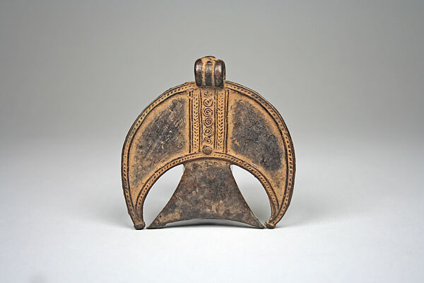 This genre of adornment includes distinctive cast copper-alloy pendants in crescent form owned by members of Nuna, Bobo, Lobi, Nunuma, Senufo, and other groups. They range from small, relatively simple versions worn by children to more ornate designs commissioned by adult women.