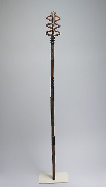 The refinement and creative embellishment of this example indicate that it was a prestige object intended for elderly men and women. It is carved from a single piece of wood, and its finial takes the form of a series of openwork triangles. The shaft is embellished through subtly inventive variations of textures and colors. Some segments of the wood surface are decorated with graphic motifs alternating with passages of delicately applied brass and iron wire work. The metal wires contrast against the rich, lustrous, dark patina of the wood, the result of extensive handling and the application of animal fats.