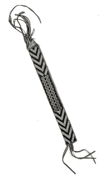 Zulu men and women wore beaded belts, or umutsha, at the waist with a small quadrilateral piece of cloth attached to cover the pubic area. Both these examples feature finely interlocked patterns of glass beads on a cloth or leather backing. The belts also feature conical brass buttons as fasteners at both ends, which is a common characteristic of the northern Zululand beadworking tradition. One belt is decorated with a five-row chevron design of green, red, and white beads on a black background, while the other belt features a variety of geometric patterns in white, green, black, and blue. The Zulu, like other southern African peoples, developed a complex form of symbolism in the colors and color combinations of their beadwork. The significance of specific colors is often related to the name that is given, for example, ruby-colored glass beads are known as inkankane, which means "whenever I see you my heart leaps up in little flames." White is generally associated with love and, when paired with black beads, implies that even in the face of love there are many difficulties. These are merely generalized interpretations, as there is no direct correlation between color and meaning. Furthermore, this complex visual language has withered in recent times and subtle meanings that were once expressed in the past are no longer understood even among elder Zulu.