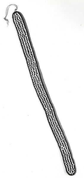 Zulu men and women wore beaded belts, or umutsha, at the waist with a small quadrilateral piece of cloth attached to cover the pubic area. Both these examples feature finely interlocked patterns of glass beads on a cloth or leather backing. The belts also feature conical brass buttons as fasteners at both ends, which is a common characteristic of the northern Zululand beadworking tradition. One belt is decorated with a five-row chevron design of green, red, and white beads on a black background, while the other belt features a variety of geometric patterns in white, green, black, and blue. The Zulu, like other southern African peoples, developed a complex form of symbolism in the colors and color combinations of their beadwork. The significance of specific colors is often related to the name that is given, for example, ruby-colored glass beads are known as inkankane, which means "whenever I see you my heart leaps up in little flames." White is generally associated with love and, when paired with black beads, implies that even in the face of love there are many difficulties. These are merely generalized interpretations, as there is no direct correlation between color and meaning. Furthermore, this complex visual language has withered in recent times and subtle meanings that were once expressed in the past are no longer understood even among elder Zulu.