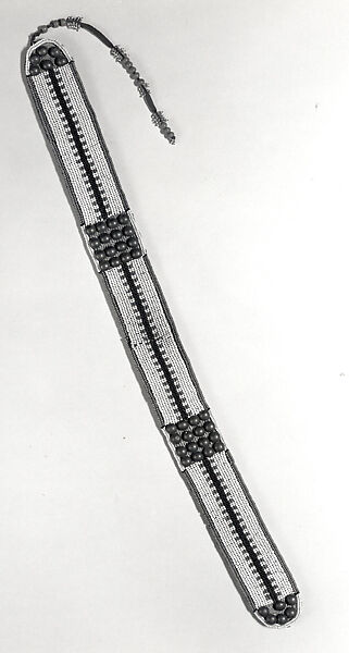 Zulu men and women wore beaded belts, or umutsha, at the waist with a small quadrilateral piece of cloth attached to cover the pubic area. Both these examples feature finely interlocked patterns of glass beads on a cloth or leather backing. The belts also feature conical brass buttons as fasteners at both ends, which is a common characteristic of the northern Zululand beadworking tradition. One belt is decorated with a five-row chevron design of green, red, and white beads on a black background, while the other belt features a variety of geometric patterns in white, green, black, and blue. The Zulu, like other southern African peoples, developed a complex form of symbolism in the colors and color combinations of their beadwork. The significance of specific colors is often related to the name that is given, for example, ruby-colored glass beads are known as inkankane, which means "whenever I see you my heart leaps up in little flames." White is generally associated with love and, when paired with black beads, implies that even in the face of love there are many difficulties. These are merely generalized interpretations, as there is no direct correlation between color and meaning. Furthermore, this complex visual language has withered in recent times and subtle meanings that were once expressed in the past are no longer understood even among elder Zulu.