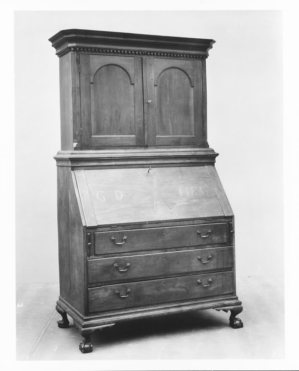 The overall proportions and detailing of this desk and bookcase proclaim it to be the product of a rural craftsman. The star inlays and the stepped interior drawers suggest a Massachusetts influence, but certain other details are sometimes found on furniture from New York or Long Island. The eastern Long Island history of the piece would explain the stylistic mix.