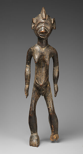 This standing figure is known locally as a ninana, a term in the Mooré language. Both the plural ninandé and singular ninana simply mean “modeled figure(s),” suggesting that such sculptures were conceived first as three-dimensional likenesses rather than as abstract symbols. This example’s long cylindrical torso, rigid arms, and diamond-pattern scarification, together with the tall central crest, place it in the Yatenga style that flourished in Mossi royal courts. The crest reproduces the elaborate gyonfo coiffure once worn by high-status women; on a royal effigy it proclaims the fertility, continuity, and dignity of the dynasty it represents. Each year at the na-poosum harvest festival clan elders approached the seated chief and arranged figures like this one before him. Wrapped in fresh cloth, adorned with beads, and flanked by bound heads of the first sorghum, the sculpture received libations and grain so that the spirits of royal ancestors might secure peace and prosperity for the community in the coming season. Successive anointings with millet beer, vegetable butter, and the blood of sacrificial animals gradually darkened the wood, giving the surface its deep, lustrous patina and recording generations of devotion. Even when changing religious affiliations led many chiefs to store such images out of sight, such figures remained a potent conduit between the living ruler and his lineage of royal predecessors.