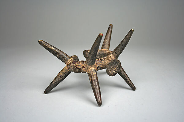Many individuals throughout Burkina Faso and Côte D’Ivoire commission elaborate bracelets, rings, pendants, and anklets to provide protection during childbirth and infancy and to ward against disease and other misfortunes caused by malevolent spirits. The imagery of such personal adornments draws upon the intercessional powers of both manmade items and elements from the natural world. Cast in brass using the lost-wax technique, protective ornaments were authored by blacksmiths, who belonged to an endogamous subgroup within their communities.