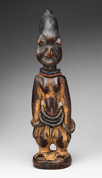 Yoruba peoples have one of the highest incidents of twin births in the world. As a result, twins are regarded as extraordinary beings protected by Sango, the deity of thunder. They are believed to be capable of bestowing immense wealth upon their families or misfortune to those who do not honor them. Powerful spirits in life, twins are honored with carved memorial figures when they die. These figures, known as ere ibeji (literally meaning ere: sacred image; ibi: born; eji: two), remain a point of access to the spirit of the departed individual. The mother provides ritual care to the figures, bathing, dressing, adorning, and feeding them. Such daily handling is responsible for giving their surface its distinctive patina. Ere ibeji invariably represent their subjects with mature adult physiognomies, and are often crowned with elaborate hairdos.