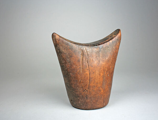 This headrest was used by its owner to elevate their head and preserve their elaborate hairstyle during sleep. Carved from a single, solid piece of wood, this block-style rest sits on a nearly circular base. The sides slope upwards from the base, widening at the center and then tapering inwards at the summit to meet the saddle-shaped platform. The medium-brown wood of the rest is nearly black at its top and upper edges, a darkening caused by the wood’s absorption of oils from the hair and its dressings. With the exception of a few vertical checks running along the grain on its narrow sides, the headrest is unornamented.