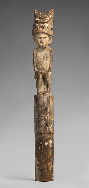Many peoples in the eastern Solomon Islands construct elaborate feast houses and canoe houses supported by carved wood posts. The imagery of the posts frequently, as here, incorporates anthropomorphic figures depicting supernatural beings or individuals associated with specific historical events. The male figure on this post is shown in a seated position, with a shark, a creature intimately associated with the spirit world, carved in relief on his back. A pair of curved motifs, possibly stylized seabirds, appears above his forehead. The larger crescents above do not represent a headdress but instead echo the form of the rounded notch in the top of the post, which once held one of the horizontal beams that helped support the roof.