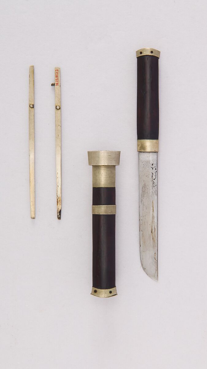 - Dimensions: Knife (a); L. with sheath 5 5/8 in. (14.3 cm); L. without sheath 5 1/2 in. (14 cm); W. 9/16 in. (1.4 cm); Wt. 0.7 oz. (19.8 g); sheath (b); Wt. 0.9 oz. (25.5 g); chopsticks (c, d); L. 3 5/8 in. (9.2 cm); W. 1/8 in. (0.3 cm); Wt. 0.2 oz. (5.7 g)