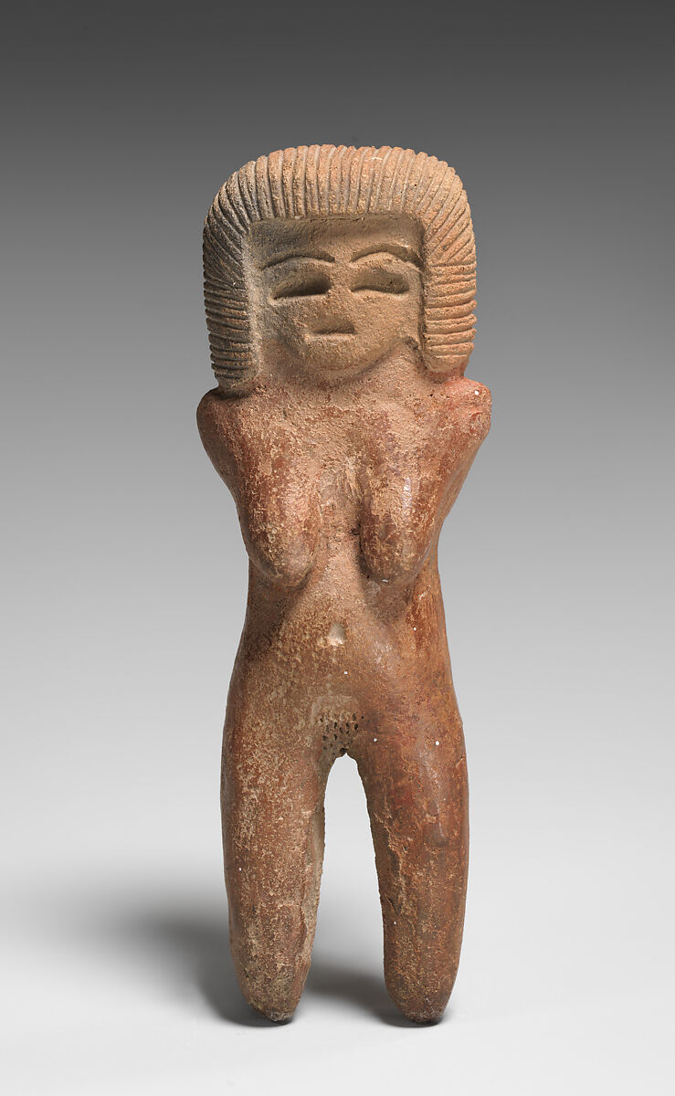 Softly shaped, this female figure stands upright with legs spread apart and bent arms covering her chest. Simple markings etched into the face create a reposed expression, while finely etched rows of hair frame her face in an elegant coiffure that falls above her shoulders. Though stiff in posture, her soft curves and stippling of her lower abdomen suggest her femininity. Traces of a terracotta-colored slip cover the figure’s body except for the face, similarly to Valdivia figure MMA 1988.117.2.