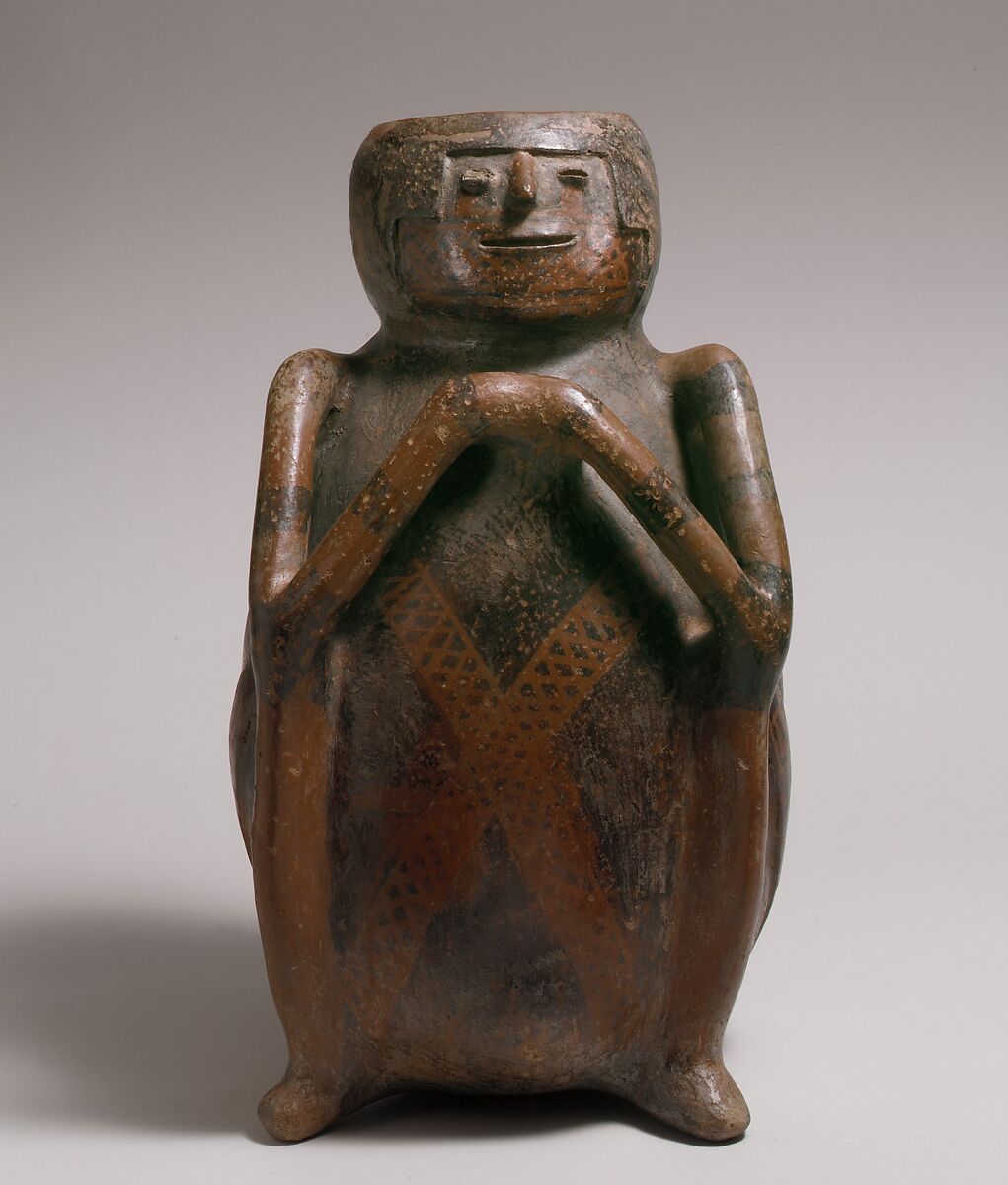 Tall, seated figure vessels of this type have been found in deep Andean shaft and chamber tombs on both sides of the Colombia/Ecuador border. The figure's barrel-shaped erect body, lacking elaboration of anatomical detail, forms the container. The vessel opening is at the top of the head. Closely cropped hair frames the small face. The slight tilt of the head conveys a sense of animation, while the modeled half-open eyes and mouth suggest serenity. The figure's legs, worked in deep relief, are pulled up against the body and the projecting feet have no indication of toes. The spindling arms—the elbows resting on the knees and the hands held on the chest—are modeled three-dimensionally, the upper arms, perhaps, having served as handles. The burnished surface of the face and body is decorated with black-on-red resist patterns of crosshatching, concentric diamonds, and stepped frets.