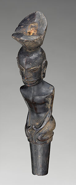 This carved figure would have formed the handle of a metal sword, possibly a piso sanalenggam used in ritual activities by the Toba Batak. The kneeling figure leans slightly forward, mirroring the curve of the now-missing blade. Attenuated arms rest on the figure’s thighs, with elongated fingers tucked between the knees and thumbs touching to create a diamond-shaped space in between the hands. A pair of elaborate ear ornaments are carved on either side of the figure’s head, which is topped with a forked headdress decorated with intricately carved foliate patterns. The headdress contains a small cavity to hold pukpuk—a powerful substance made from ritually prepared human and animal remains—that would give the sword added strength and power.