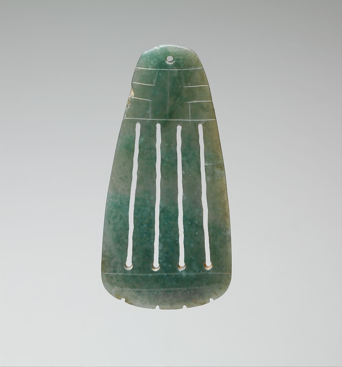 This jade pendant is carved with an axe-like profile and thinned into a translucent plaque. A drilled hole at the top of the pendant may have been used to suspend it as part of Olmec ritual regalia. Four parallel lines run the length of the pendant, made by a combination of drilling and string-sawing. An incised cruciform design, a motif common in Olmec art, probably references the cardinal directions.