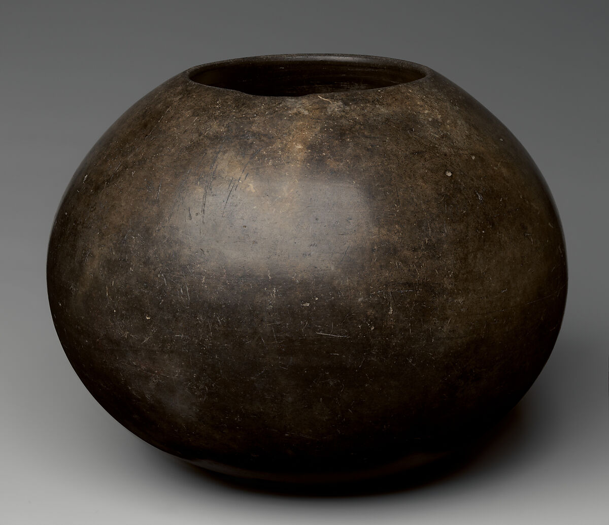 This bowl is in a full, round shape with a small opening at the top. A potter carefully built this thin-walled vessel using a coil technique with a kaolin-like clay, finishing it with a dark slip and then burnishing it to create a shiny surface. The vessel type is known as a tecomate (“gourd”), named after the gourds that inspired their original form. Some of the earliest ceramic vessels in Mesoamerica took the form of gourds captured in the more durable material of fired clay. Tecomates were important receptacles for community feasts, and many were subsequently placed in burials as important funerary offerings.