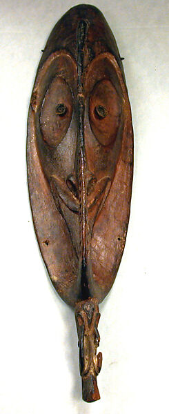 The distinctive mai masks of the Iatmul people of the Middle Sepik region are characterized by oblong faces with elongated noses that often merge into arch-like forms that join the nose to the chin or extend below it. Mai masks are carved and danced in pairs, portraying elder and younger supernatural siblings, either brothers or sisters. Worn by young men and boys, the masks are attached to conical basketry costumes that cover the dancer’s head and upper body. Mai mask performances begin with the construction of a fenced compound. Within it, the men build a raised platform, with a backdrop depicting the mountains where, according to oral tradition, the masks originated, and a ramp that extends over the wall to the ground outside. As the performance begins, the mai maskers burst from behind the backdrop and stride down the ramp. Reaching the ground outside, they are joined by the women, who accompany them to the dancing ground, where a lengthy performance ensues before the dancers finally retire into the men’s ceremonial house.