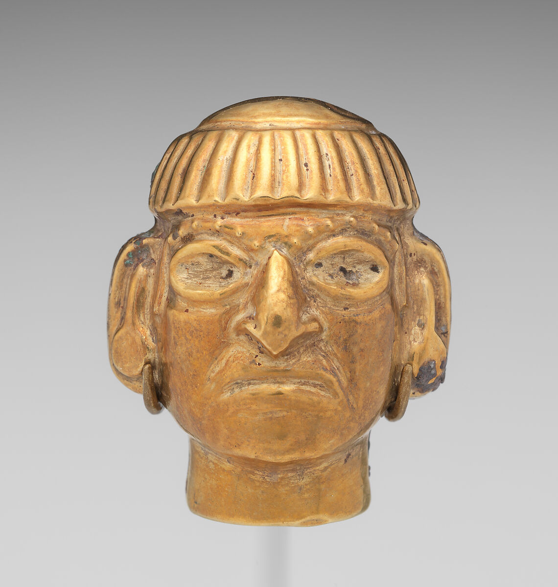 This head is one of at least six likely from the same necklace (see also MMA 1991.419.52, .53, .55, .56, .57). The beads depict the head of a high-status individual of ancient Peru’s Moche culture. Made by shaping a sheet of hammered gold over a mold, the individuals wear circular ear ornaments, a feature indicative of their social position. Pairs of perforations on either side of the head suggest the beads were double strung, as was customary for Moche necklaces (see, for example, Alva and Donnan, 1993: 93, fig. 95).