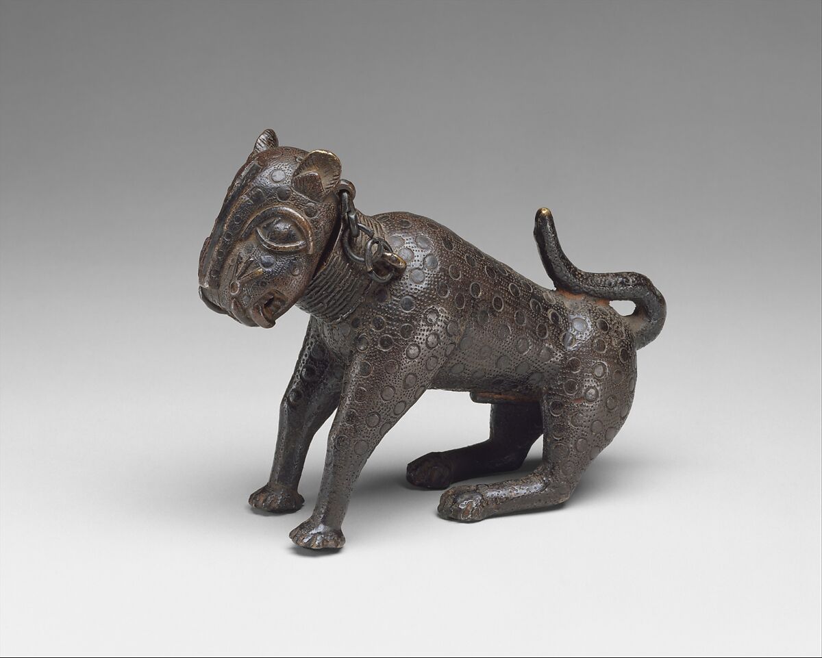 The leopard is the most common form of zoomorphic aquamanile made in Benin. Coined "king of the bush," it is one of the principal symbols of the Oba in Benin art, expressing his ferocious, aggressive nature. It is particularly associated the Oba Ewuare the Great, the legendary source of brass vessels in Benin.