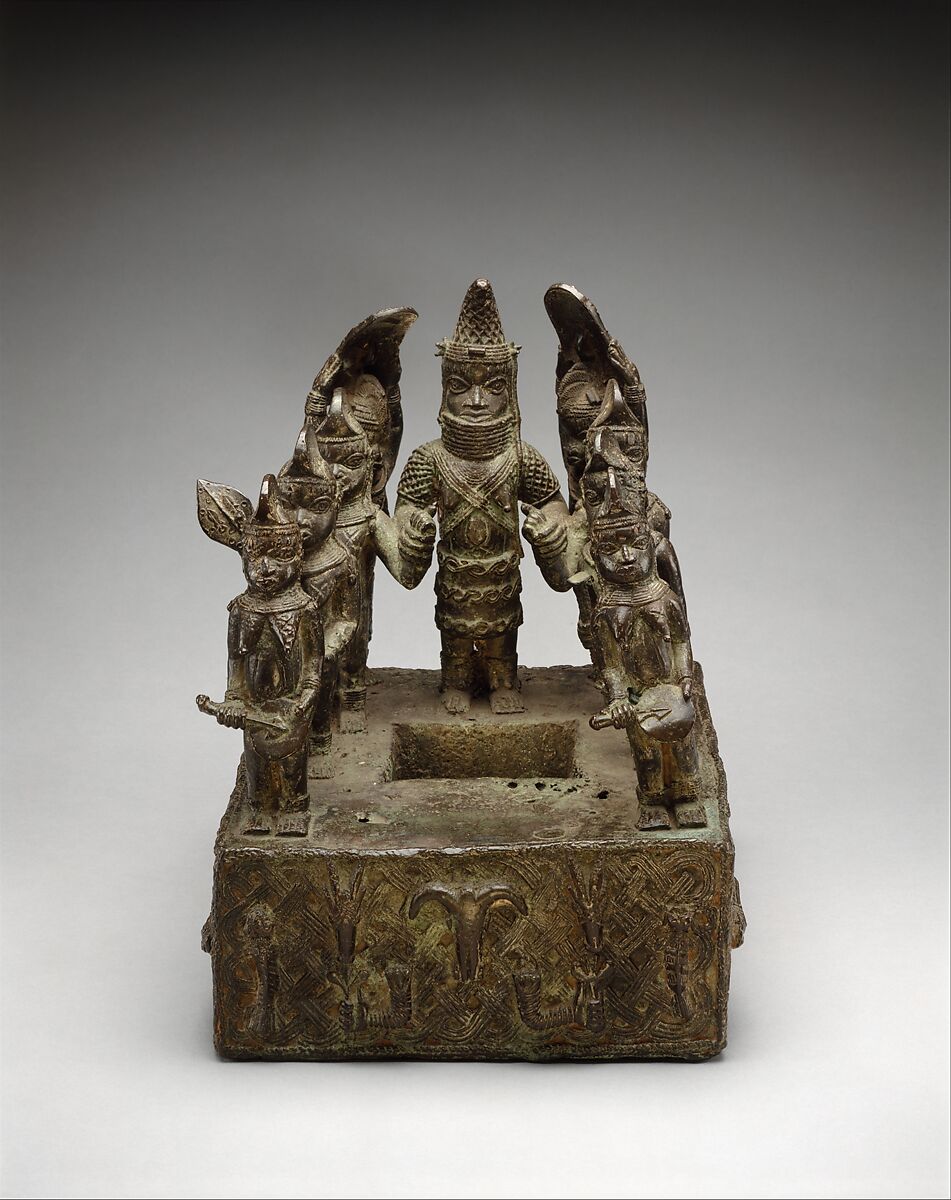 This cast brass tableau, or urhoto, was originally displayed on an ancestral altar dedicated to the mother of a ruler of the Benin kingdom. The queen mother, or iyoba, occupies an important place within the political hierarchy of the Benin court. By protecting the health and well-being of her son, she helps to safeguard the security and prosperity of the entire kingdom. In light of her position, she is entitled to certain prerogatives enjoyed by high-ranking male titleholders, such as a luxurious palace, a coterie of attendants, and the right to commission sculpture in ivory and brass. After her death, a large altar dedicated to her memory is constructed within the palace and decorated with an assemblage of sculptures that celebrate her achievements and facilitate communication with her spirit in the afterlife.